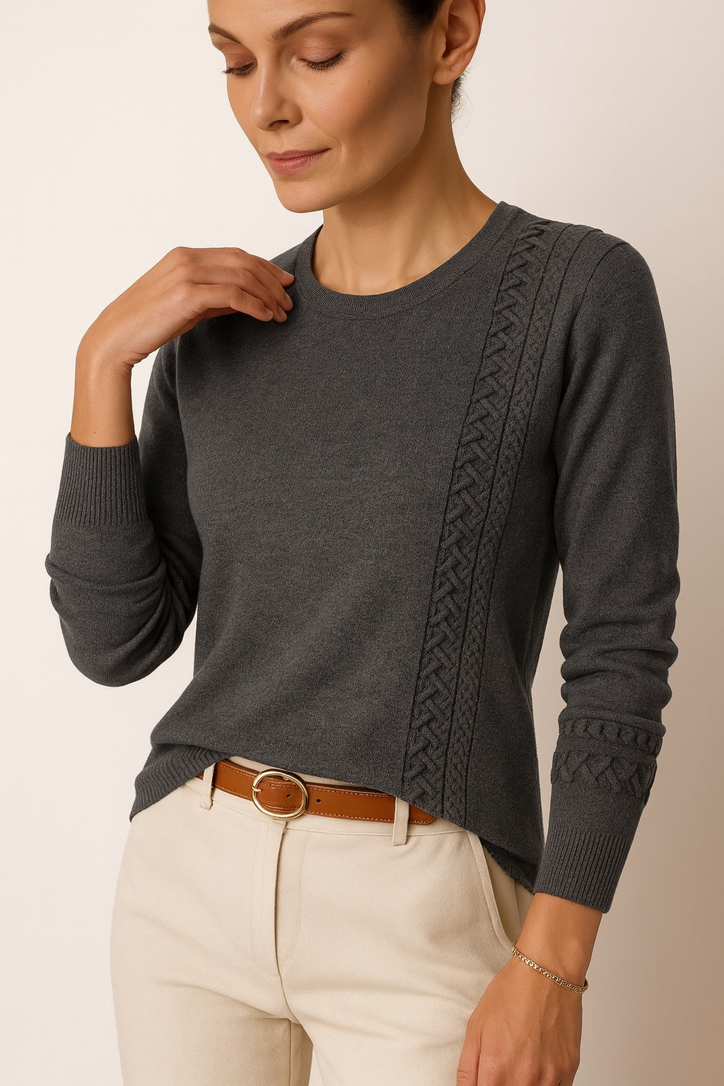 Crafted in our Stolen Softness™️ Proprietary beloved yarn blend for a soft feel, the Weave Tunic features a classic long sleeve silhouette with braided detailing on front and cuffs. Created in a tight, yet comfortable fit including a fitted torso and slits on the cuffs. This top comes in a multiple colorways from neutrals like Ivory, to playful hues like Teal or Flamingo. With its elevated details and playful colors, it's perfect for any occasion from a shopping day to a work meeting. A sleek, yet artistic piece, with classic style.