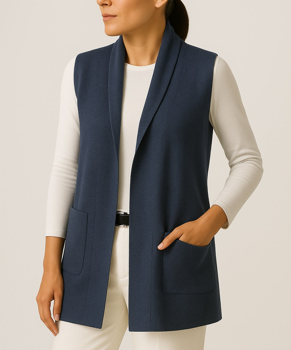 The Odense Vest is knit in our Stolen Softness™️ Proprietary beloved yarn blend. With a clean, sleeveless silhouette and a tailored finish, it's designed to slip effortlessly over tees, blouses, or dresses. Soft, structured, and a hint of subtle depth -- a perfect option for transitional seasons. Whether styled casually or polished up, this versatile piece brings quiet sophistication to any ensemble. A polished layer with classic styling.