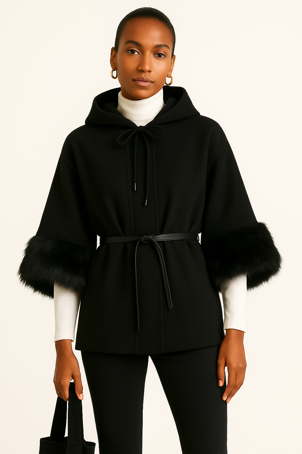 The Fur-Trimmed Hampstead Hoodie, created in our Stolen Softness™️ Proprietary beloved yarn blend for a luxurious feel, features a relaxed fit hoodie with a neck tie closure and 3/4 sleeve length. Fur trimming surrounds the cuffs, adding charm and seasonal texture. Offered in Black, this hoodie is cozy yet refined -- perfect for alpine getaways or browsing shops on a windy city days. A cozy and refined layer.