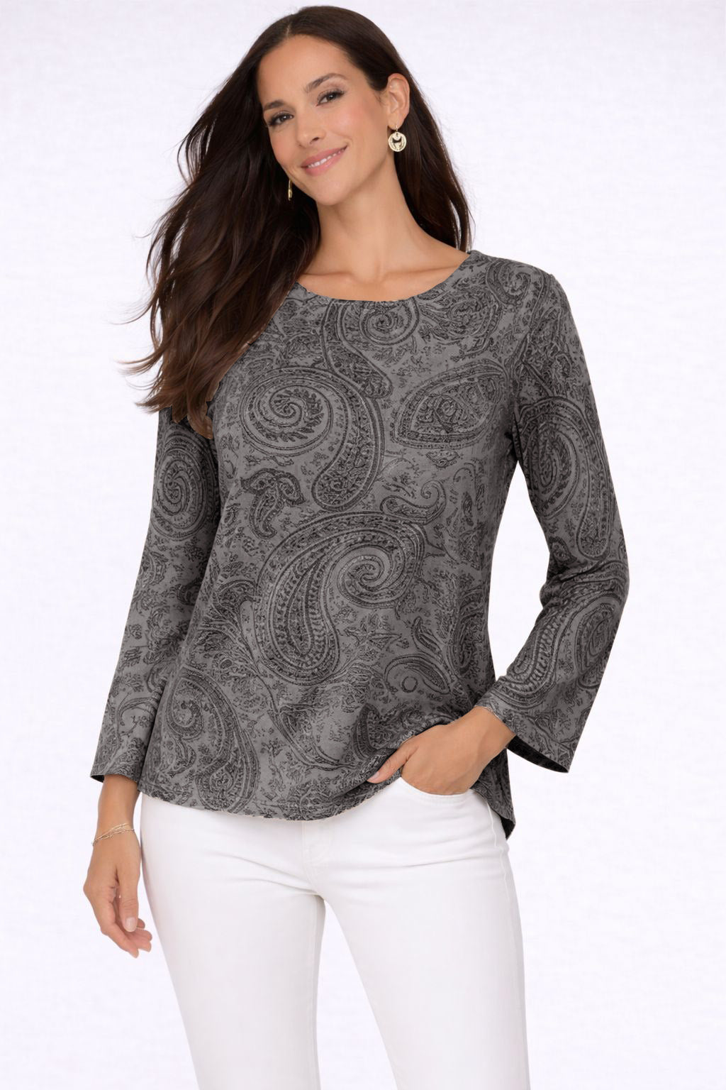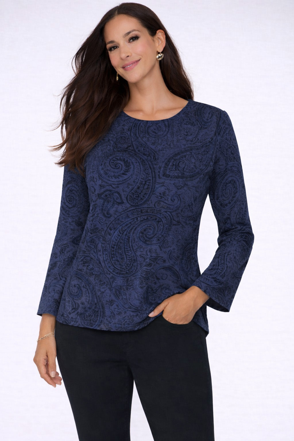 Crafted in our Stolen Softness™️ Proprietary beloved yarn blend, The Marrakesh Paisley Top is feminine piece that hugs the body without feeling tight. The deep V neckline flatters the frame, while the long sleeves and fitted silhouette make it ideal for layering or wearing solo. A paisley print covers the top, which lends a touch of old-world charm with modern refinement. Timeless yet expressive, it's a versatile piece that transitions seamlessly from day to dinner -- paired with denim or a skirt.