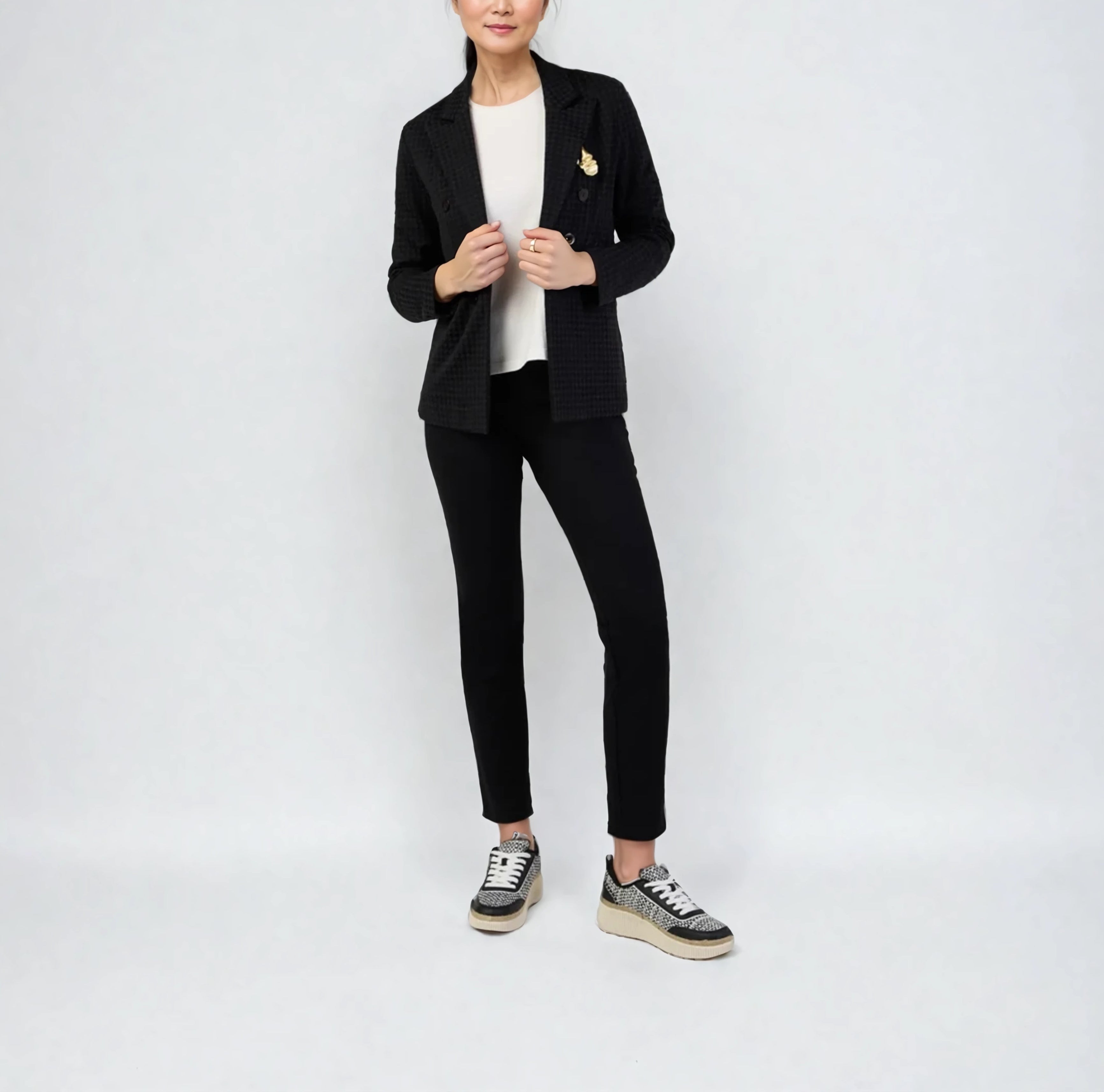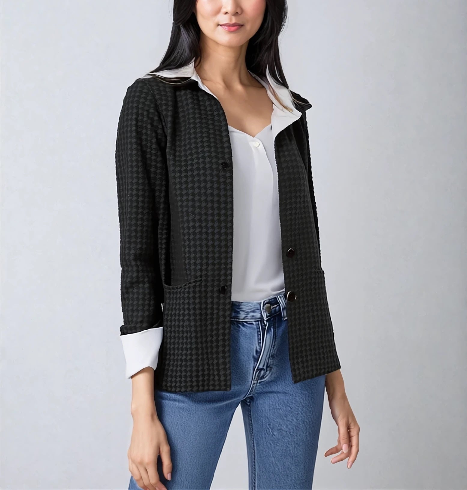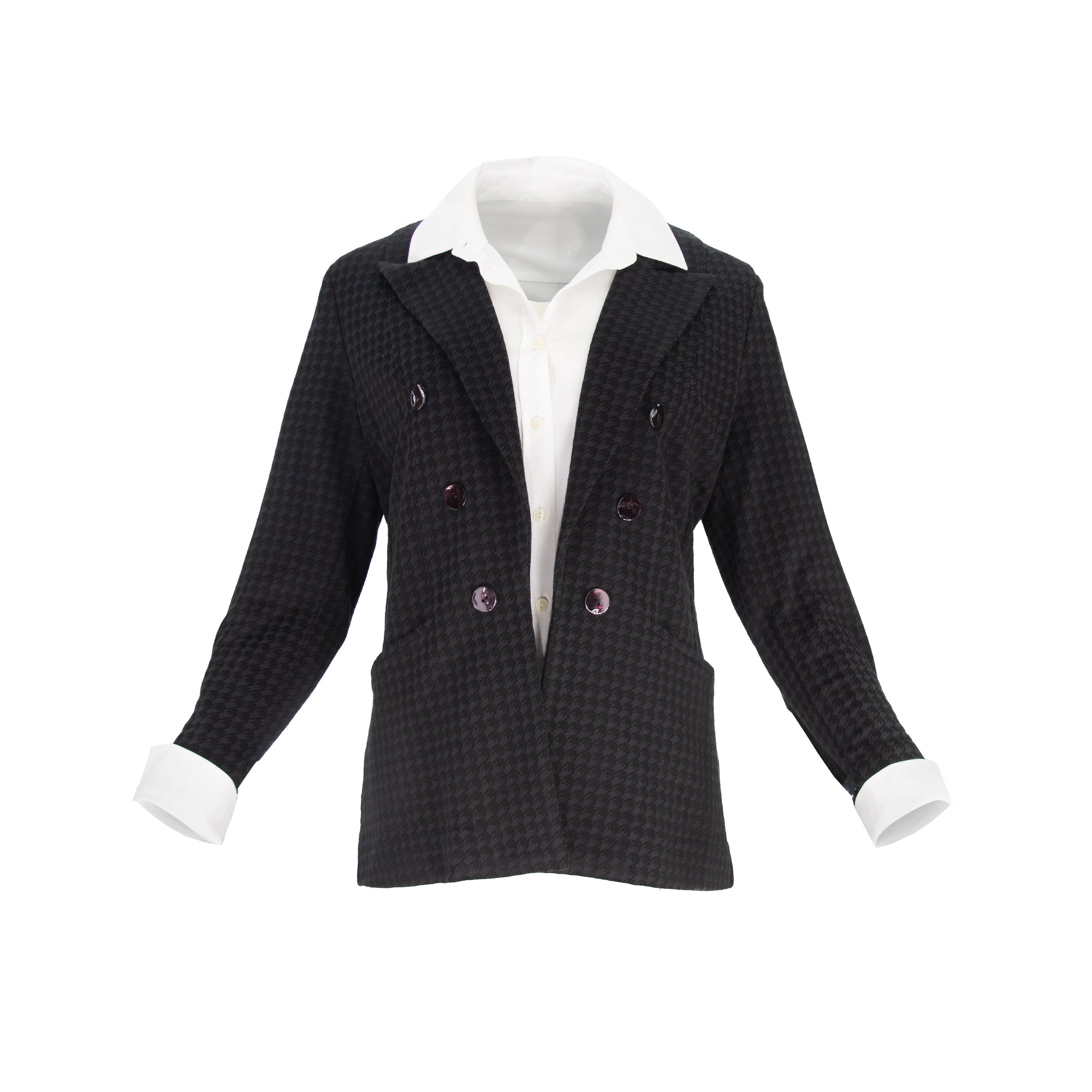 Created in our signature woven fabric, the Classic Houndstooth Jacket combines classic tailoring with a modern twist. Its tailored fit and sharp lines highlight the timeless Houndstooth pattern, while a collar and double breasted buttons add a refined look. Available in Black, it's a classic for effortlessly stylish looks for both workdays and weekend outings. A perfect balance of classic style and contemporary flair.