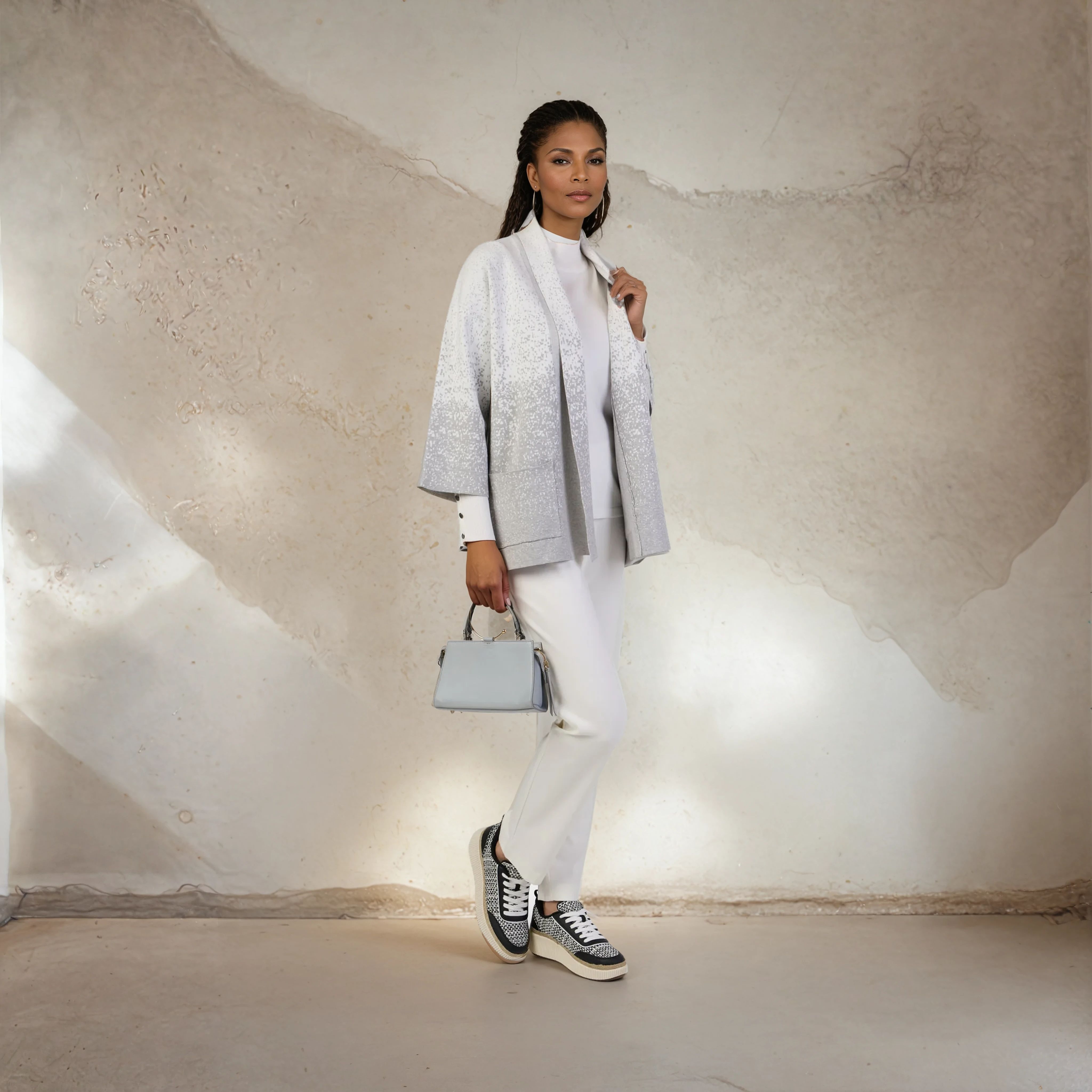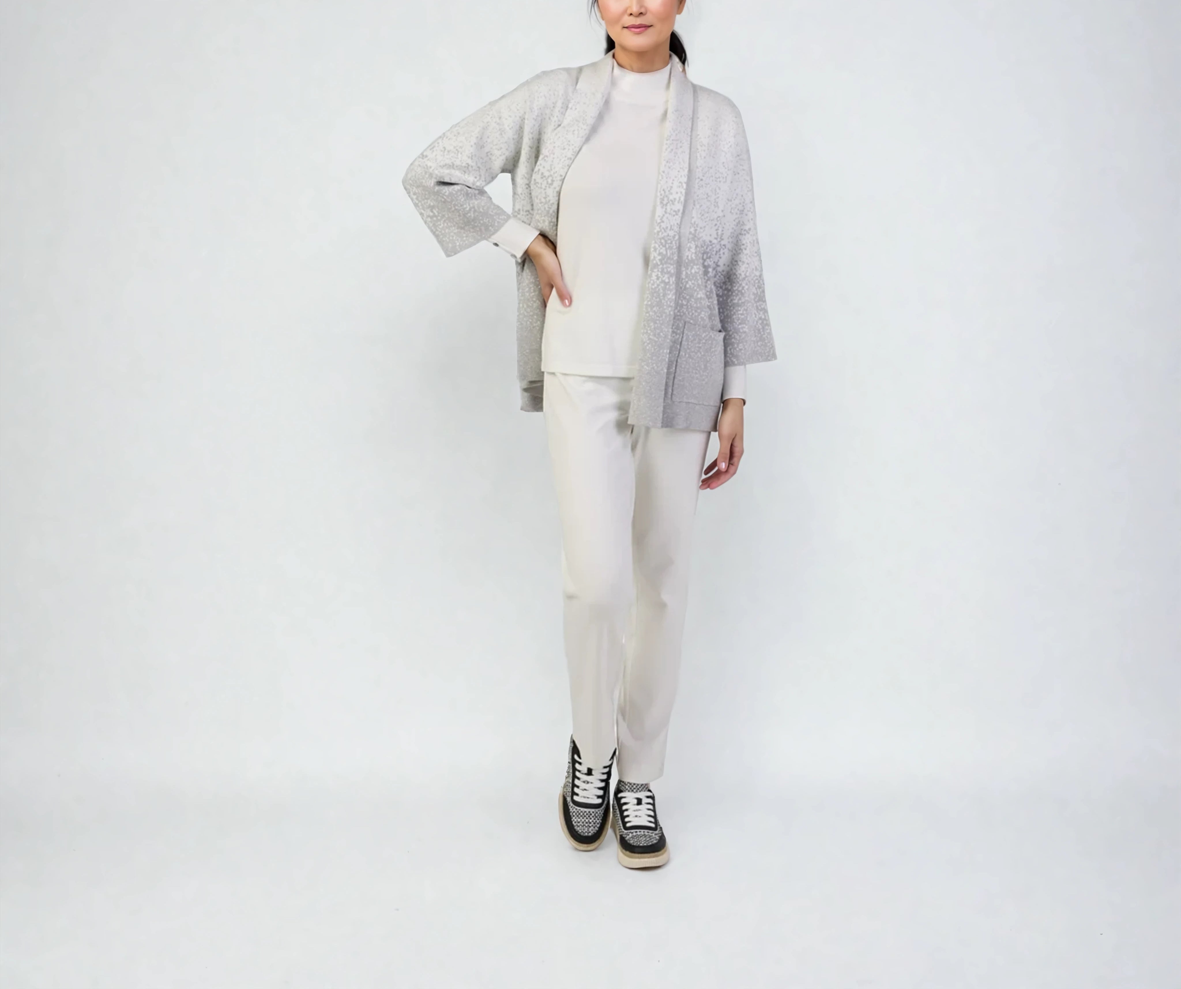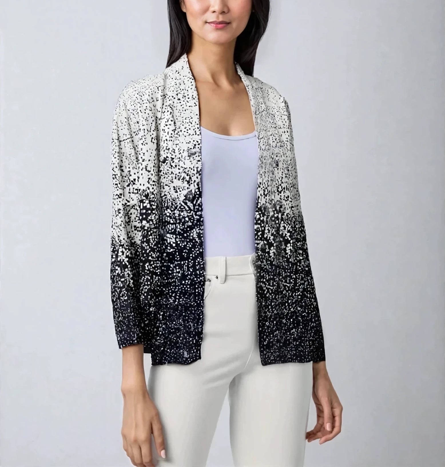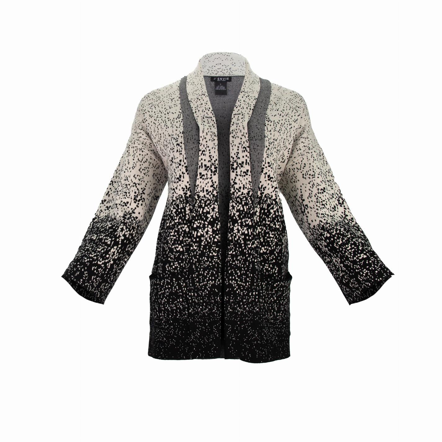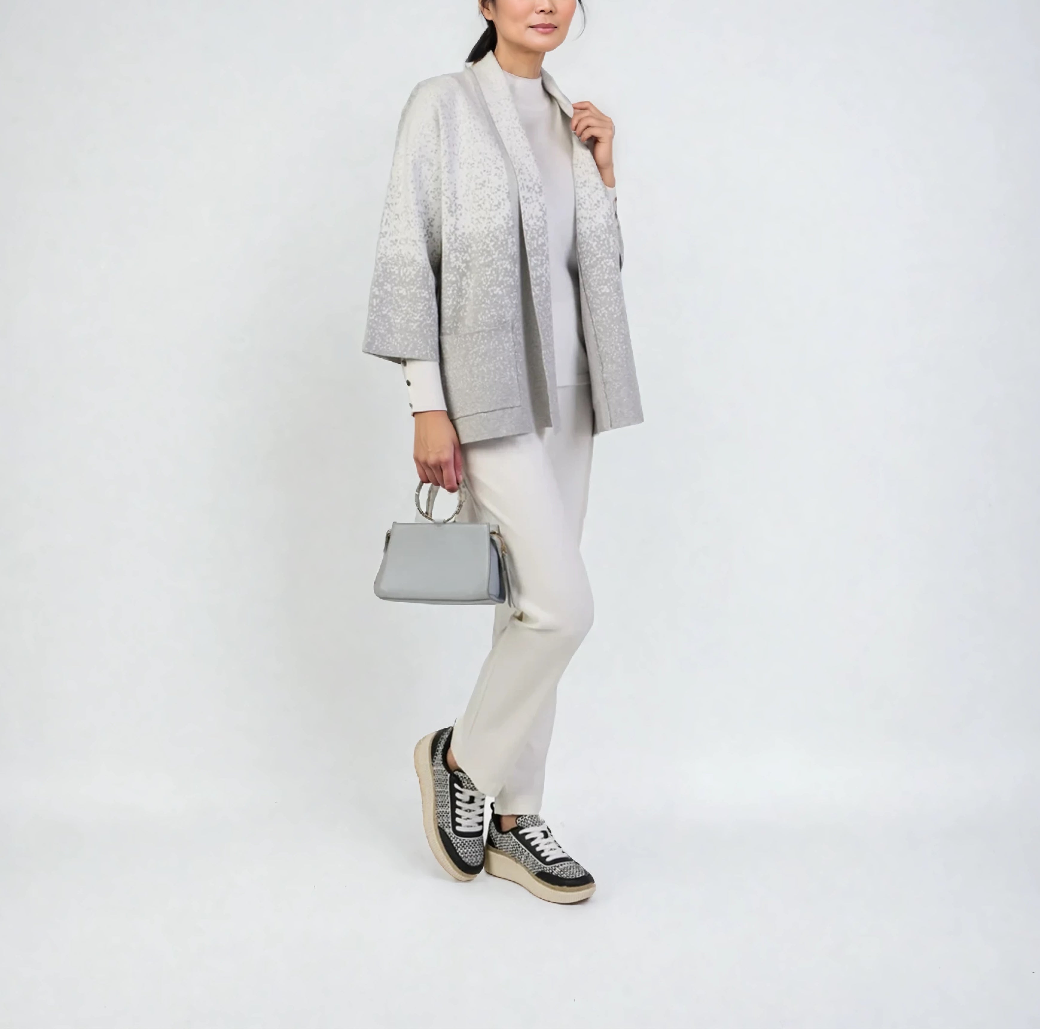 The Salzburg Ombre Coat is an oversized, artful layering piece featuring a subtle stippling ombré print that gently transitions through soft hues. Designed with our Stolen Softness™️ Proprietary beloved yarn blend in with a relaxed silhouette, it drapes effortlessly for a modern, sophisticated look. Available in neutral colorways like Ivory/Stone or edgey Black/Ink. Perfect for elevating both casual and refined outfits with a touch of understated elegance. Edgy and artistic -- A great statement piece.