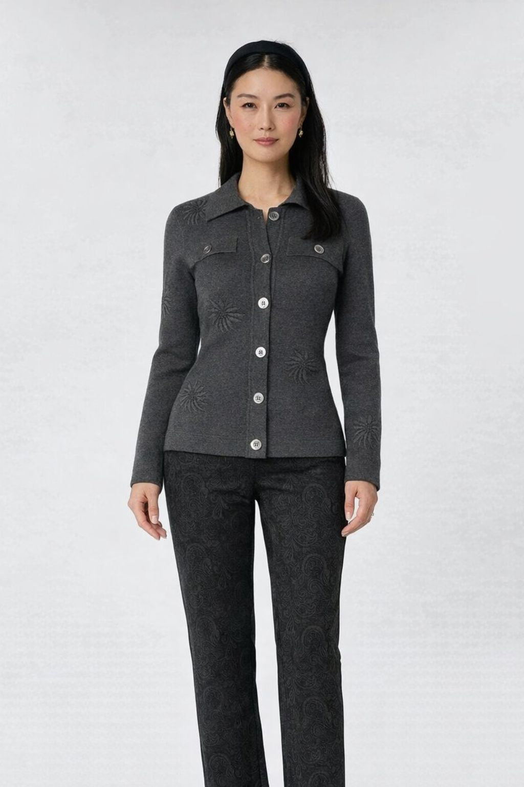 The Siena Bloom Embriodered Jacket, created in our Stolen Softness™️ Proprietary beloved yarn blend for a handcrafted feel, features a classic button-front silhouette with thoughtful detailing. Two pockets at the chest add charm, while a crisp collar and shell-colored buttons keep the look polished. A delicate floral embroidery creates a playful, yet elevated look. The fit is relaxed but tailored, ideal for pairing with trousers for work meetings or styled open with denim for a casual stroll through a city. A tailored, yet feminine piece, with modern style.